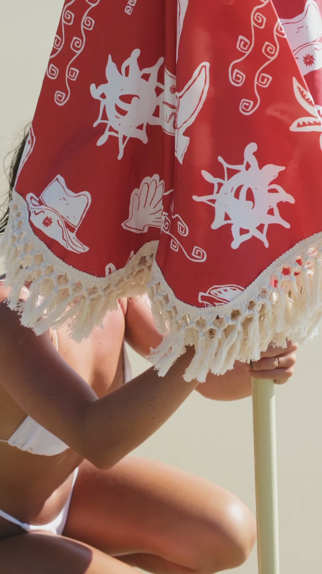 Elevate your beach days with our Tassel Travel Beach Umbrella, designed to combine style, portability, and reliable sun protection. Featuring a recycled polyester canopy with UPF 50+ sun protection, this chic umbrella ensures you stay cool, comfortable, and protected while enjoying the outdoors.